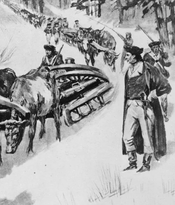 In fact, Knox repeatedly rescued the Continental Army at some of its most perilous moments. In the winter of 1775-76, he travelled to Fort Ticonderoga in upstate New York to retrieve nearly sixty great guns, which he then transported across the Berkshires to artillery-starved American forces outside Boston.